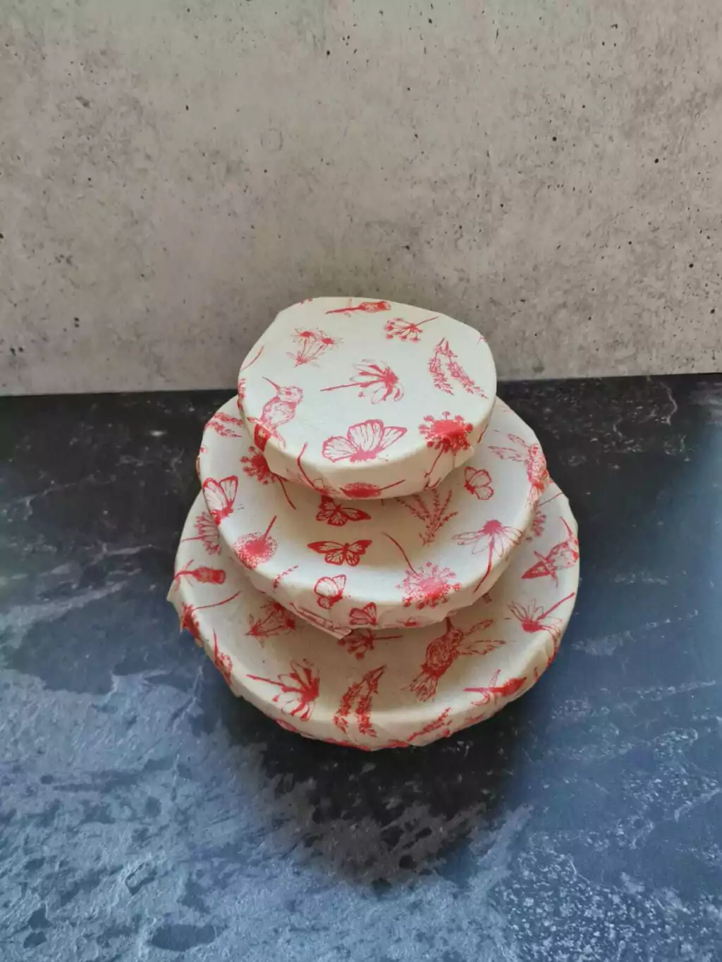 •  Paños Ecológicos hechos género 100% algodón, Cera Virgen de Abeja , resina de pino y aceite de jojoba. Estos ingredientes crean una barrera antibacterial y antimicotica, permitiendo que tus alimentos se descompongan mas lento y se mantengan frescos por mas tiempo.